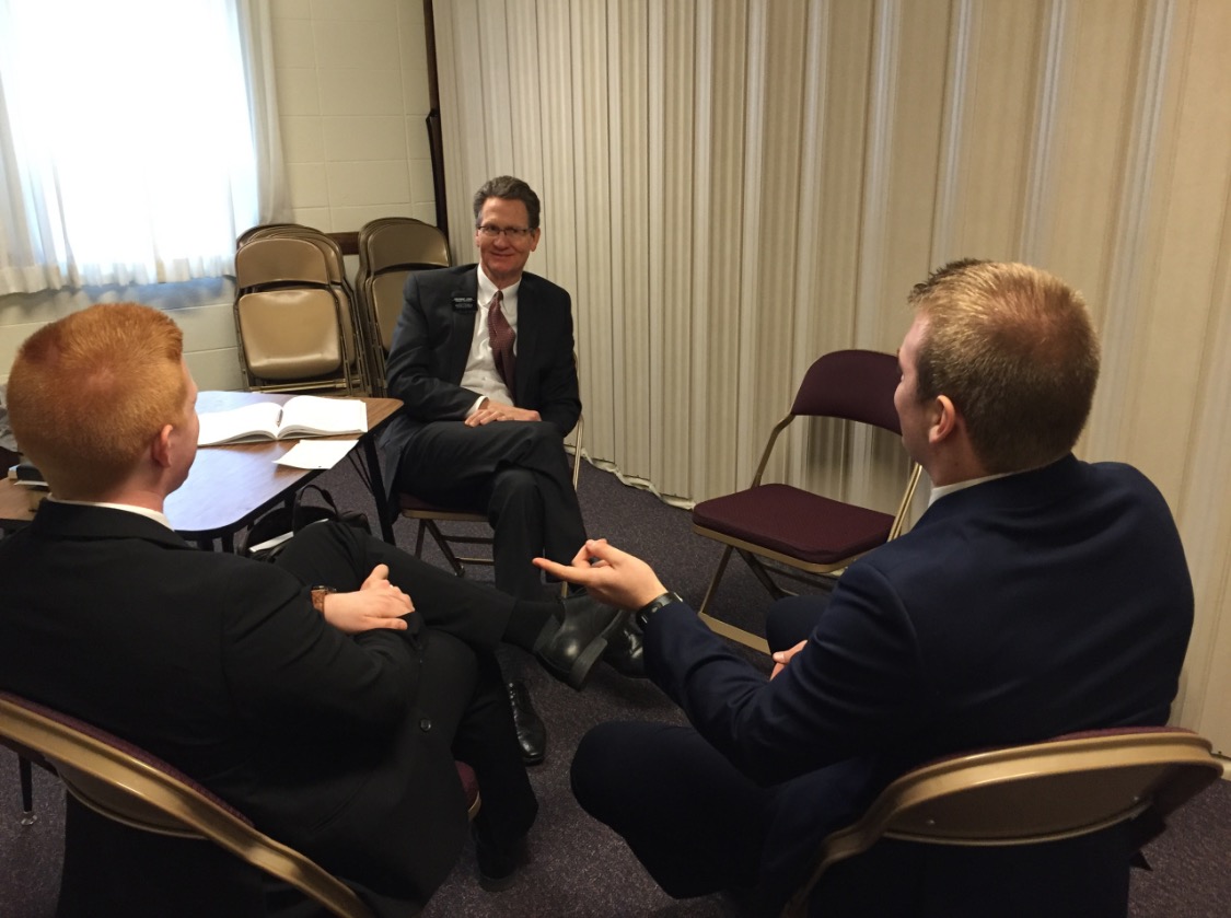 President Lewis meeting with ZL Elder Woodward and Elder Oliver